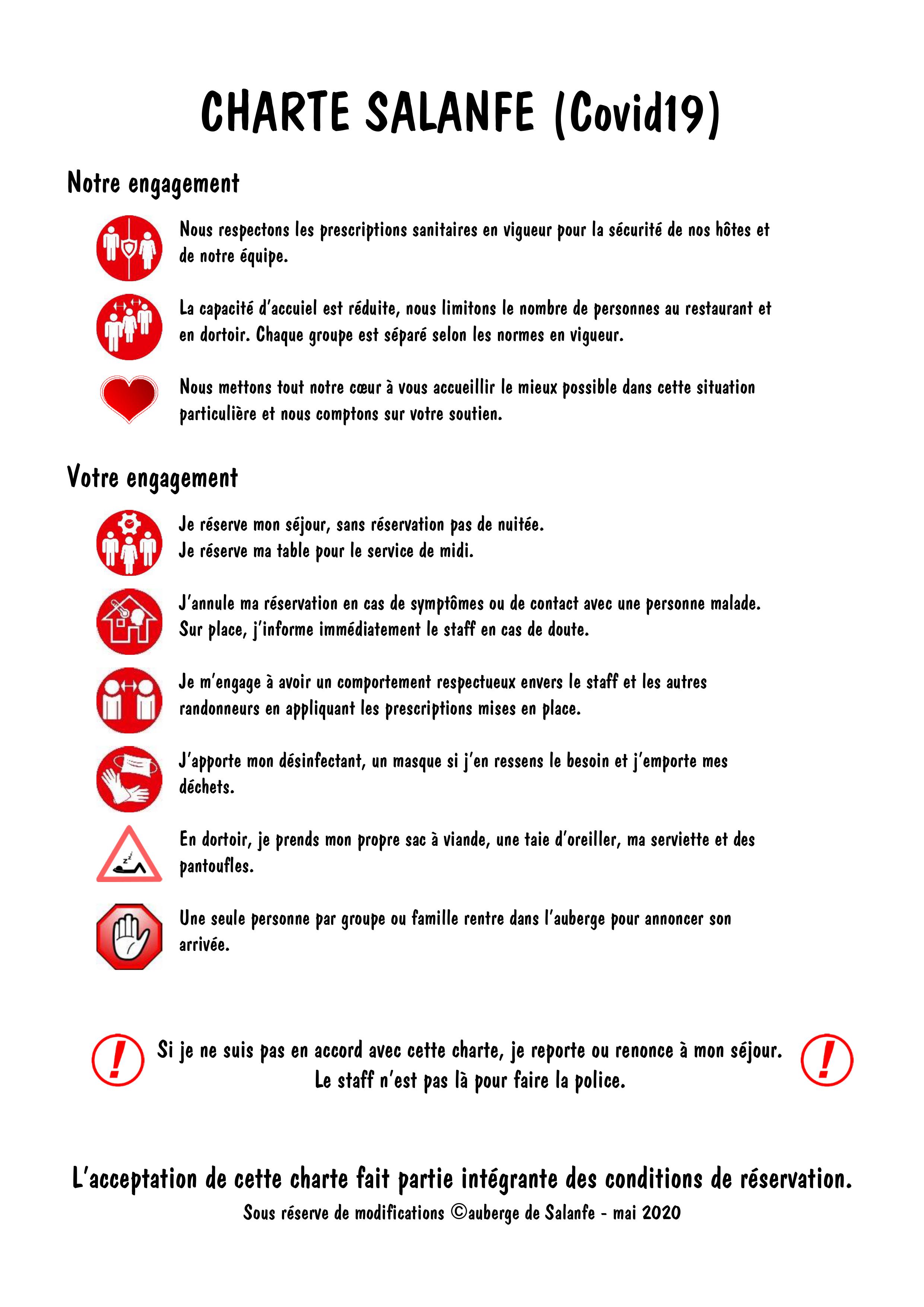 Prévue pour le jeudi 3 juin 2021, nous espérons que l’ouverture de l’auberge se fera dans de bonnes conditions. Quoiqu’il en soit, nous maintiendrons au minimum notre concept de protections sanitaires (hygiène et séparation entre les groupes) et vous demanderons d’être en accord avec notre charte Covid19 .